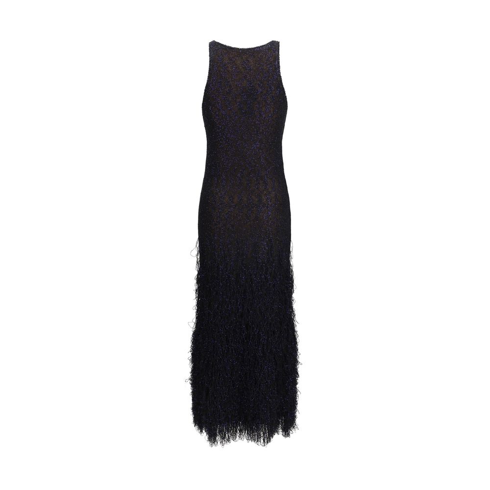 The long sequin-knit Dress by Giorgio_Armani stands out for its fluid and elegant silhouette, designed to enhance the figure with lightness. Crafted from knit fabric embellished with tonal sequins, it features a halterneck that highlights the shoulders and neckline. The semi-sheer design adds depth and sensuality, while the fringe detail at the hem brings movement and dynamism. A refined and luminous piece, perfect for special occasions.
