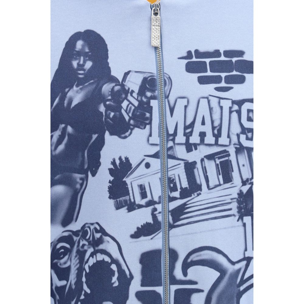 The Zip-Up Hoodie in cotton by PDF Channel features a classic oversized silhouette that blends subtle refinement with bold urban style. Crafted from high-quality cotton, it offers exceptional softness and comfort. The design includes a full-length zip fastening, a large hood and long sleeves finished with ribbed cuffs and hem, highlighting its careful construction. The blue fabric provides the perfect backdrop for statement streetwear-inspired prints on both the front and back, referencing animal and urban motifs with a contemporary old-school aesthetic.