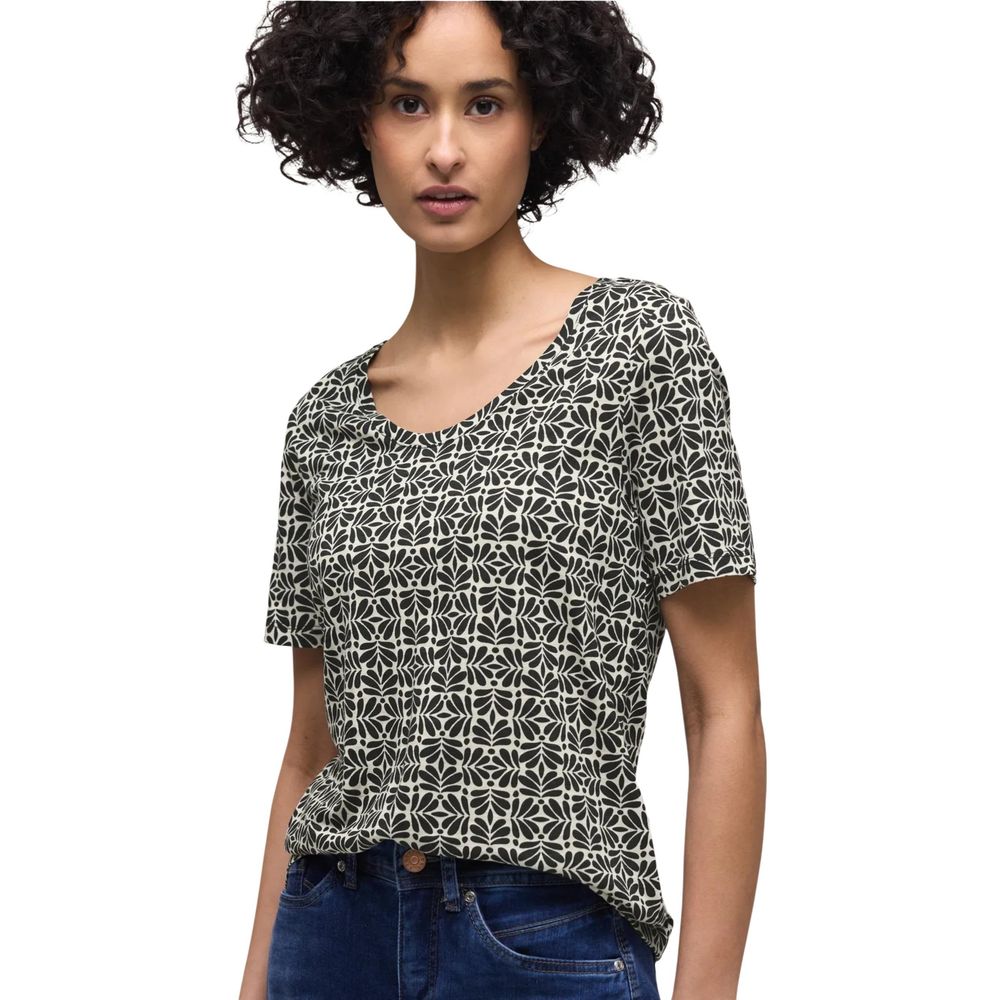 The Street One Style New Gerda women’s t-shirt, model 324798, combines comfort and style in a versatile and on-trend garment. Crafted from a premium blend of 50% Modal and 50% Modacrylic, it feels soft and light against the skin, making it perfect for spring and summer. The short sleeves and all-over geometric pattern add a modern and dynamic touch to your everyday outfits. Its regular fit cut and round neckline enhance femininity without compromising practicality, making this t-shirt suitable for both casual and sophisticated looks. An easy-to-match essential for any contemporary wardrobe.