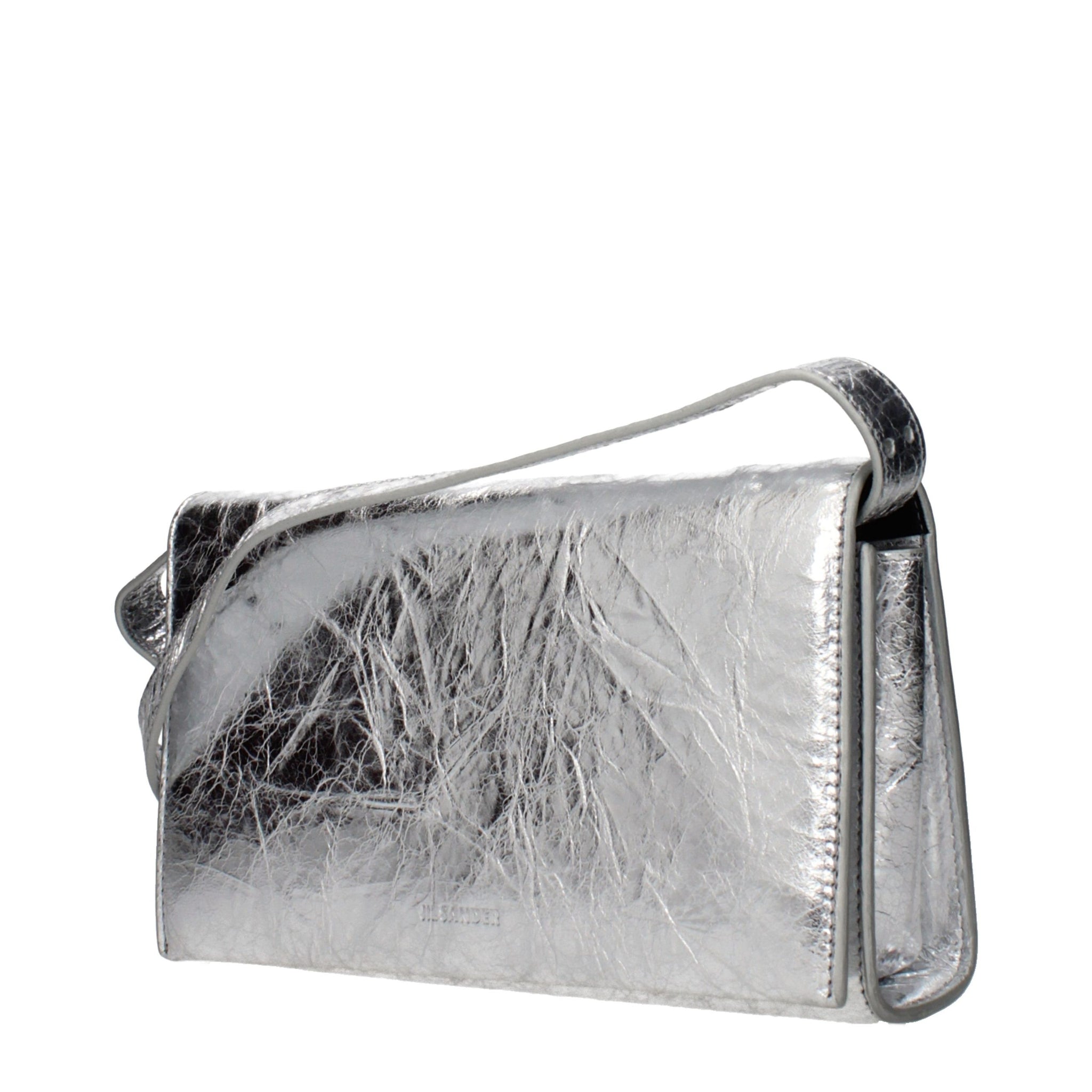 The product with MPN ZH0012P6595040 and code F86177 leather in silver is a crossbody bags designed by Jil Sander. It has features like metallic effect, aged effect, vintage effect, front logo, adjustable shoulder, removable shoulder.