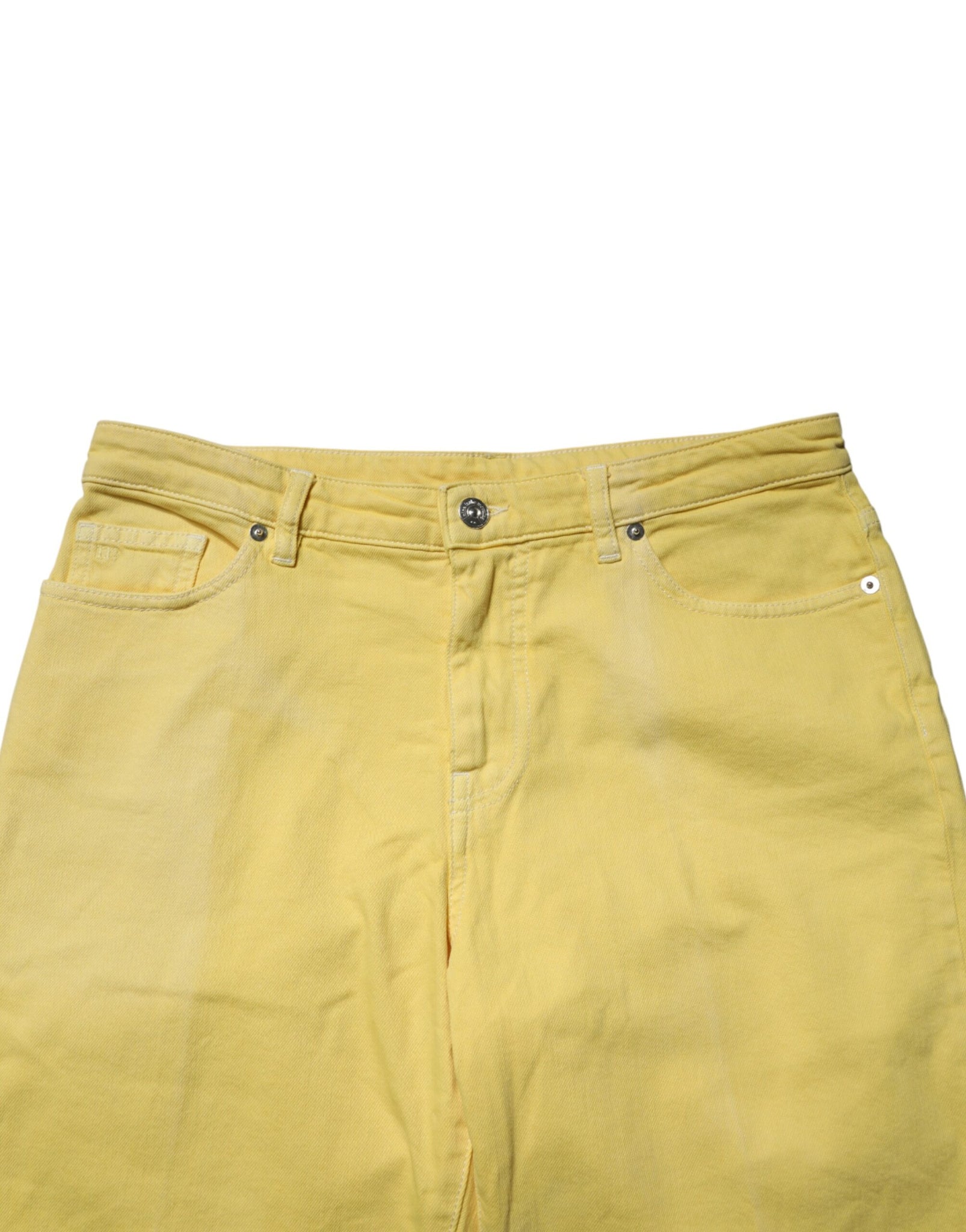 yellow denim trousers, designed in a mid-waist fit with a clean tapered leg for a modern, streamlined silhouette. Crafted from quality denim, they offer everyday comfort with a standout color that elevates casual looks with effortless style.